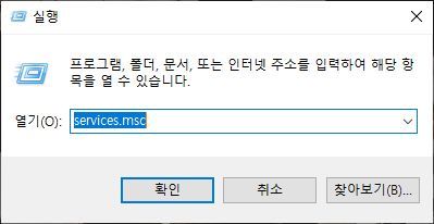 이후 입력창에 services.msc를 입력하고 확인을 눌러주시면 서비스 관리 도구 열립니다.